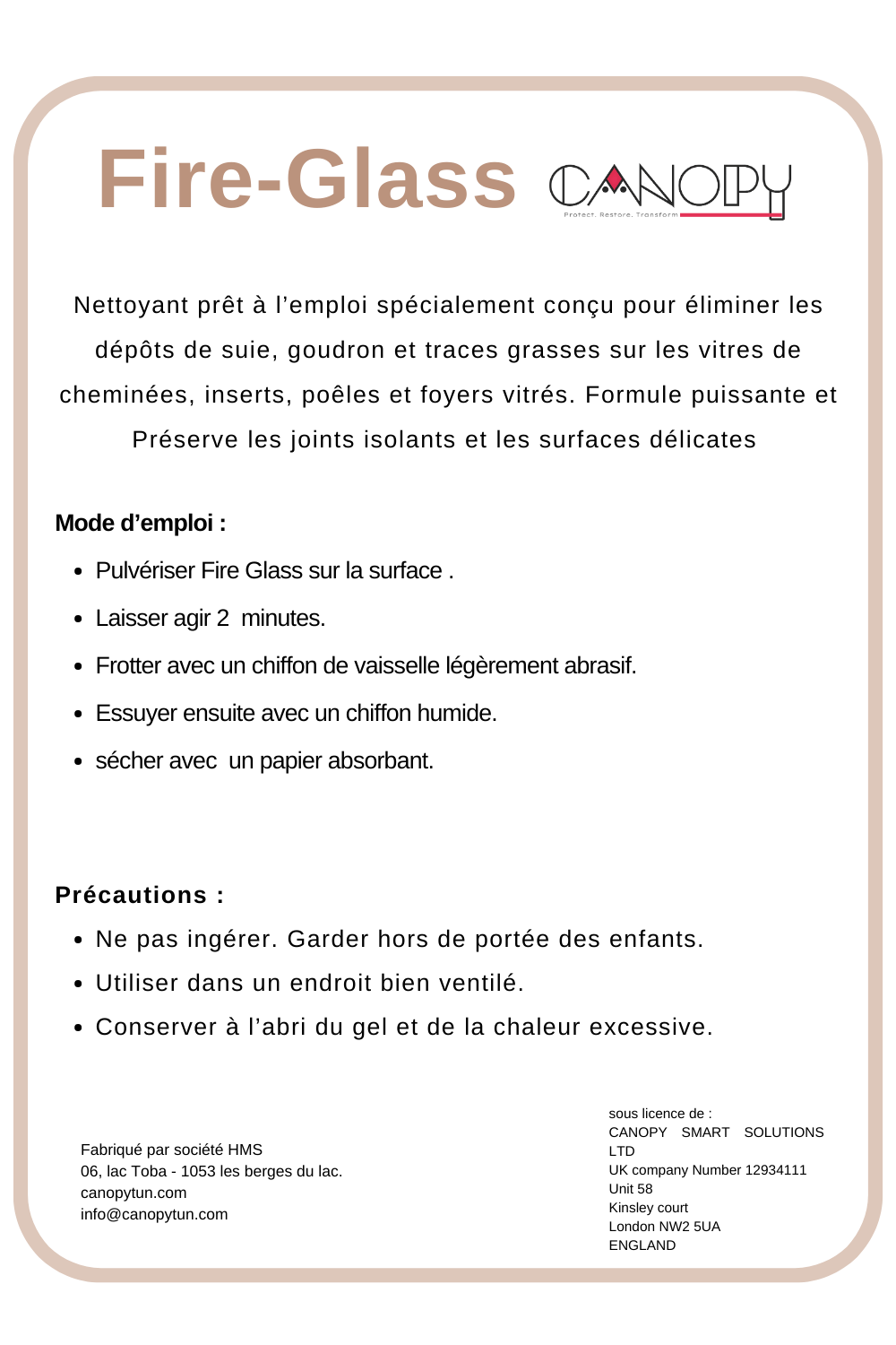 Fire Glass CANOPY est un nettoyant professionnel conçu pour éliminer facilement les traces noires, la suie, les résidus de combustion et les dépôts tenaces sur les vitres de cheminées, inserts, poêles à bois et poêles à granulés.